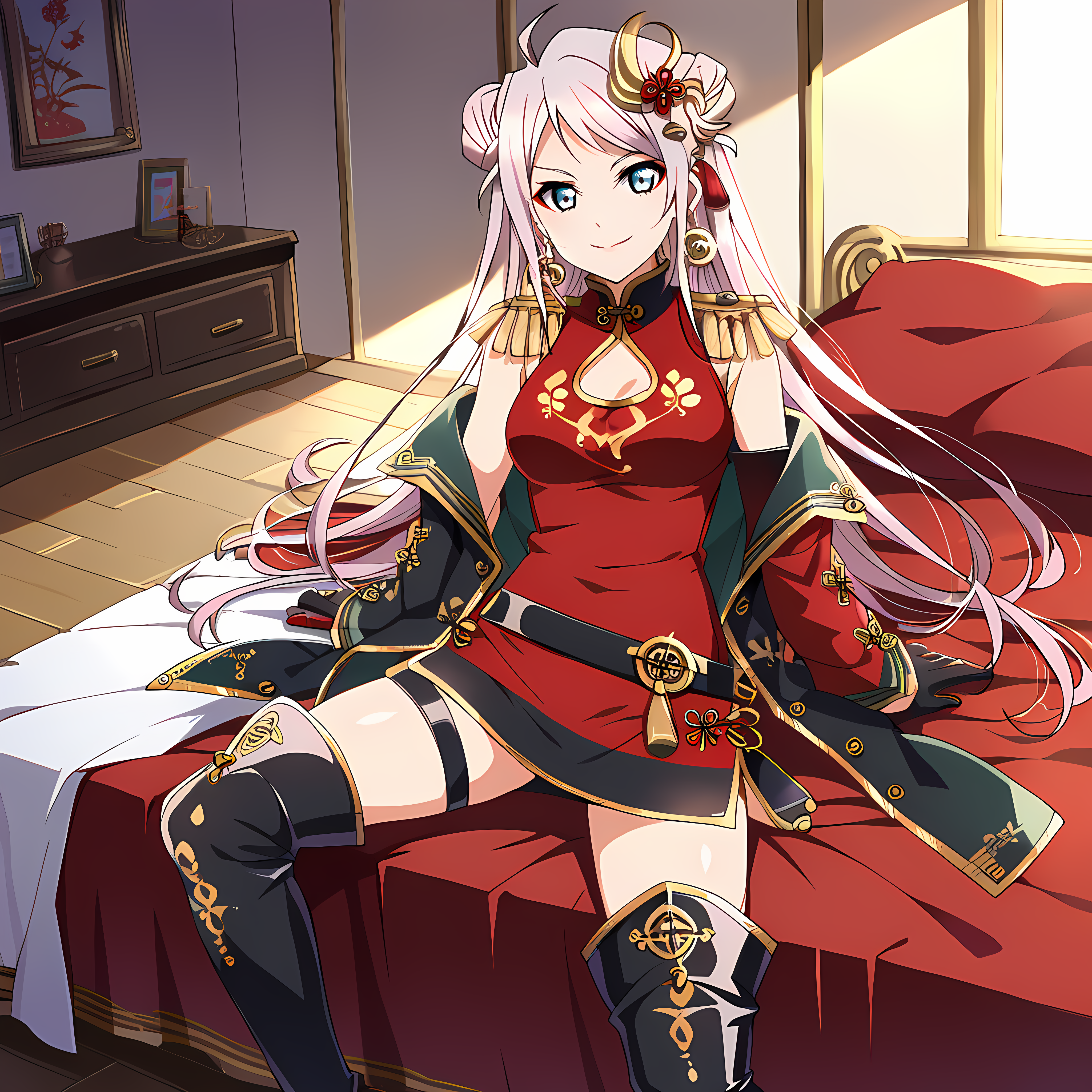 zhonglanshu2, 양쪽 위로, 메이크업, 더블 둥근 머리끝, zhongcha 머리 장식, zhongcha 한쪽 장갑, zhongcha 귀걸이, zhongcha 드레스, zhongcha 재킷, zhongcha 벨트, zhongcha 허벅지 부츠, zhongcha 허벅지 스트랩, 어깨에 재킷, 빨간 네일,