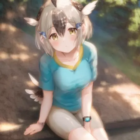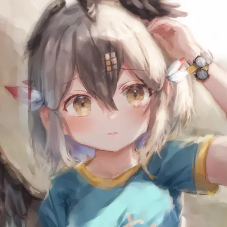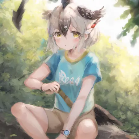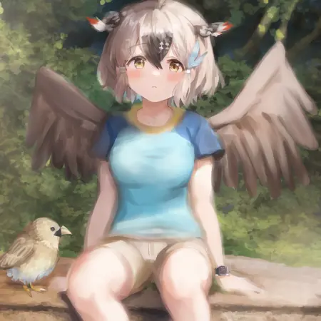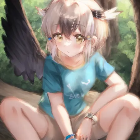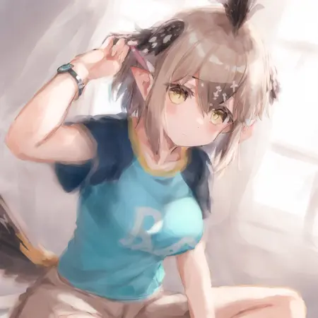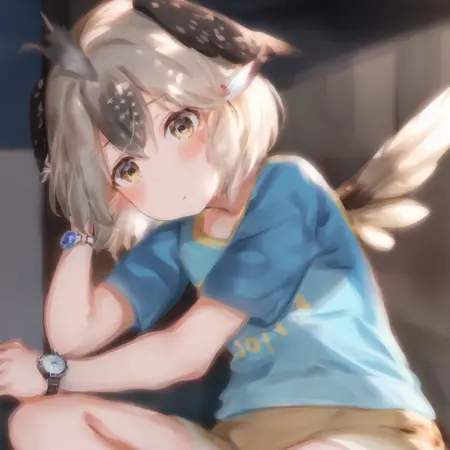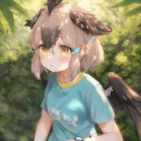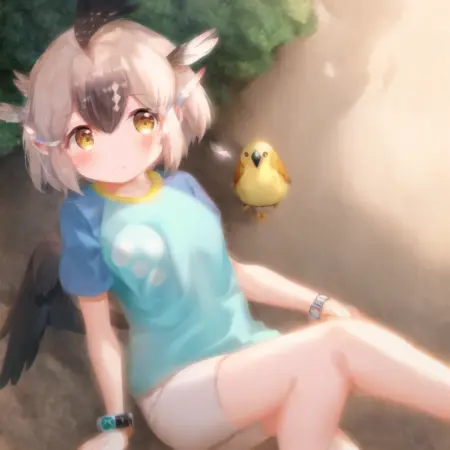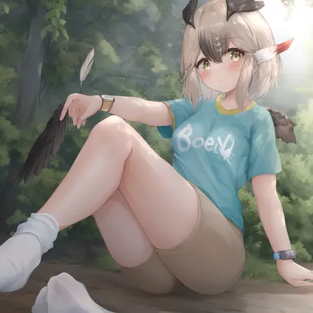 Generation tags: kusomeepchan, 1girl, ((solo)), shirt, beige hair, short sleeves, head wings, bird tail, beige bike shorts, short hair, hair between eyes, aqua t-shirt, shirt writing, bangs, hair tubes, yellow eyes, feather hair ornament, sidelocks, bare arms, watch