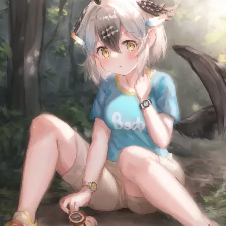 生成标签:kusomeepchan, 1girl, ((solo)), shirt, beige hair, short sleeves, head wings, bird tail, beige bike shorts, short hair, hair between eyes, aqua t-shirt, shirt writing, bangs, hair tubes, yellow eyes, feather hair ornament, sidelocks, bare arms, watch