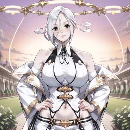 기본 외모: Sandalphon_dragalia, 눈에 있는 상징, 녹색 눈, 흰 머리, 창백한 피부, 흰 재킷, 긴 소매, 드러난 어깨, 복잡한 환상, 목에 매듭, 배꼽,