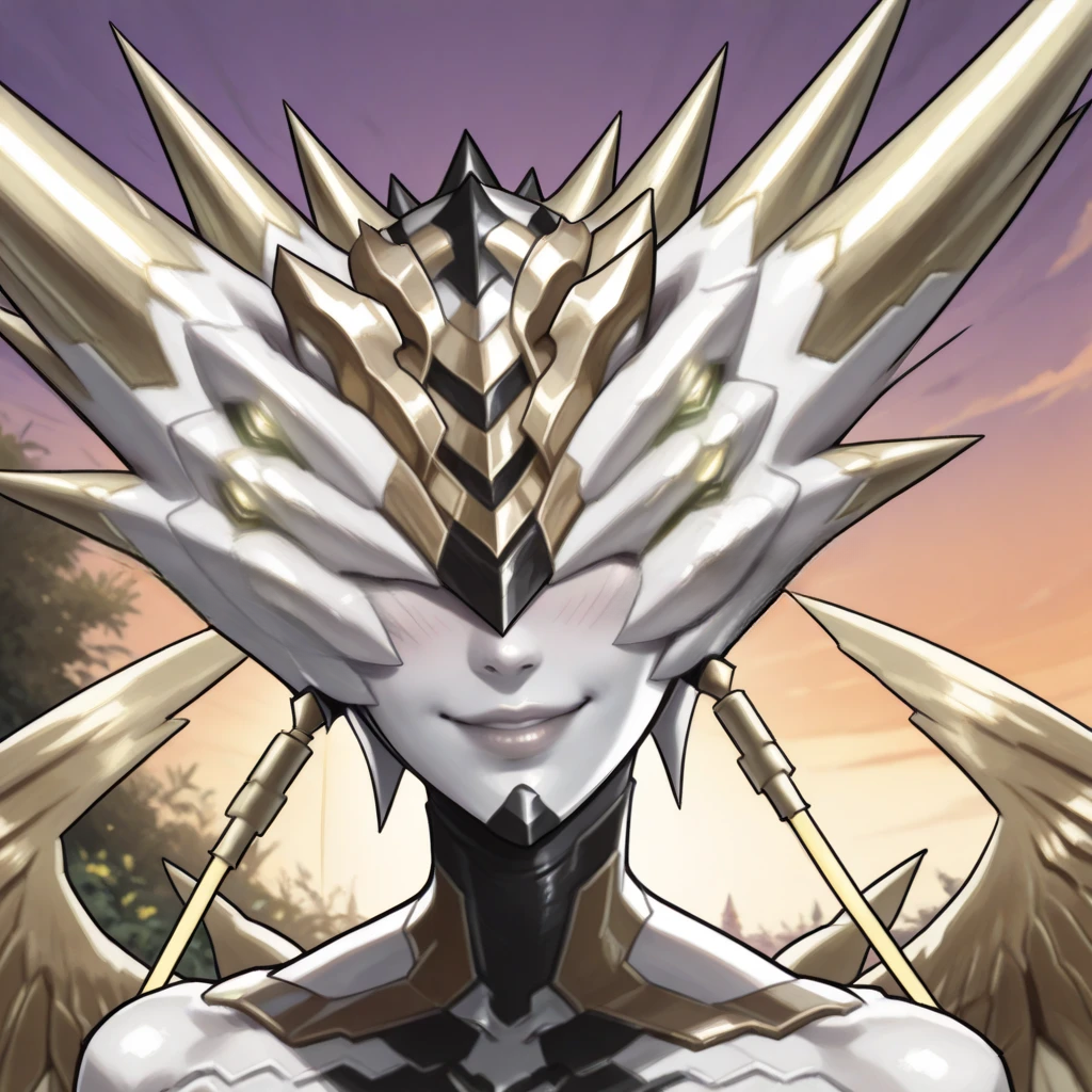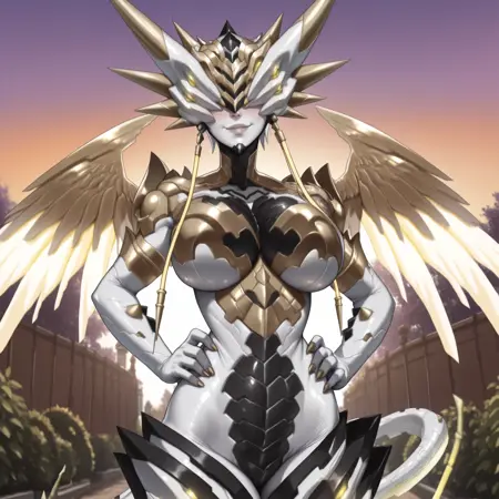 천상의 날개(명예 전용): HeavenlyWings, 몬스터 소녀, 몬스터 형태, 노란색 눈, 네 개의 눈, 빛나는 눈, 무표정한 얼굴, 헬멧, 뿔, 창백한 피부, 날개, 갑옷, 꼬리, 노란 빛, 디지몬(생물),