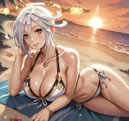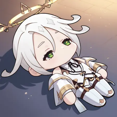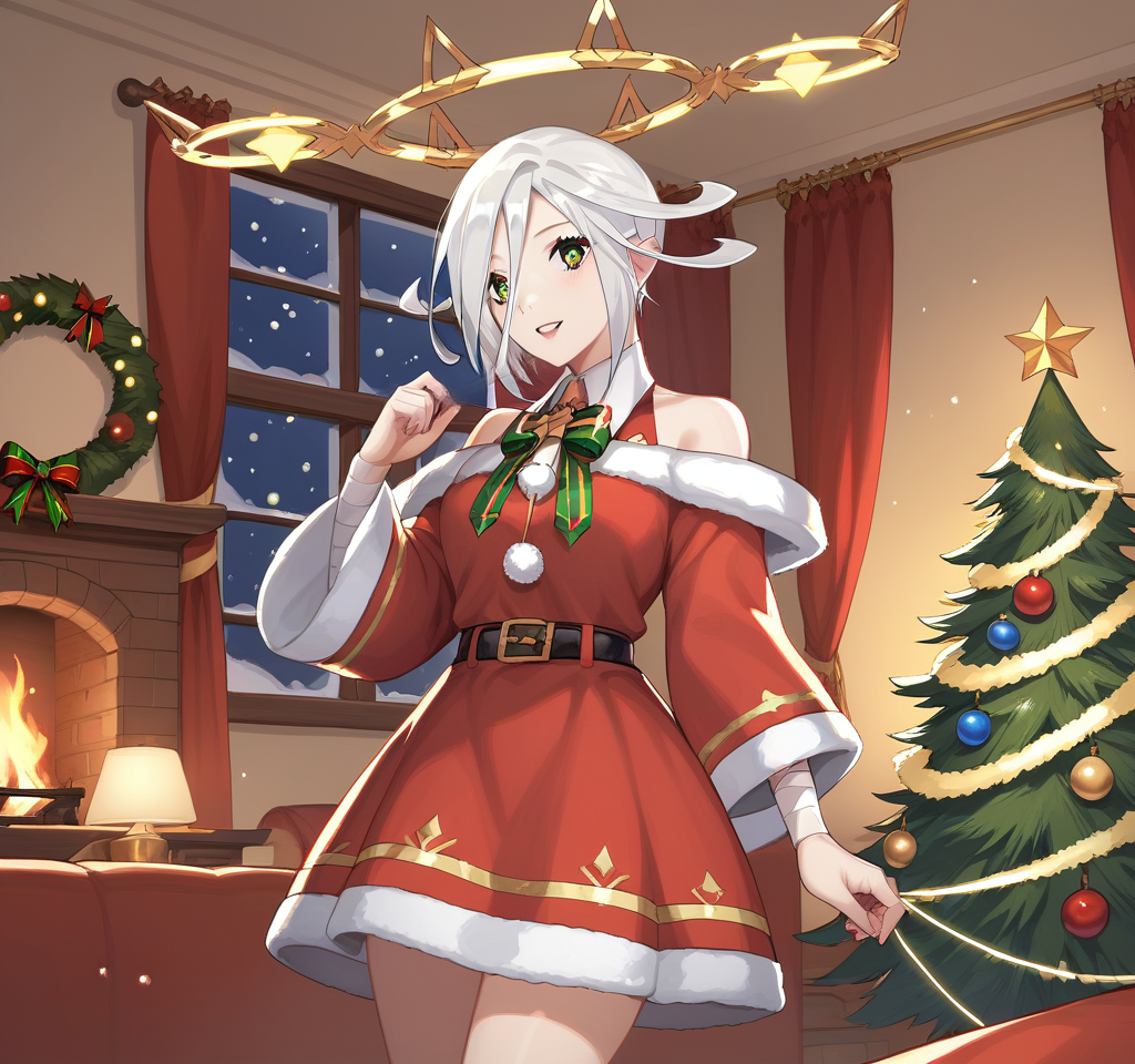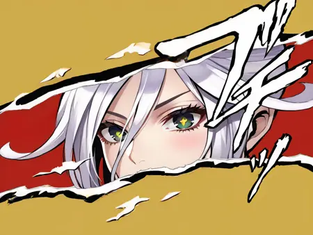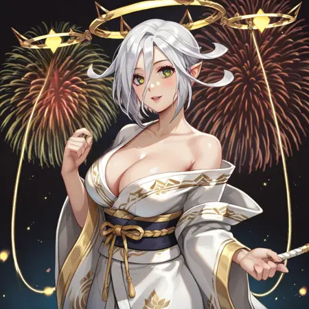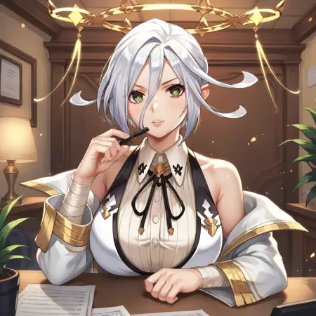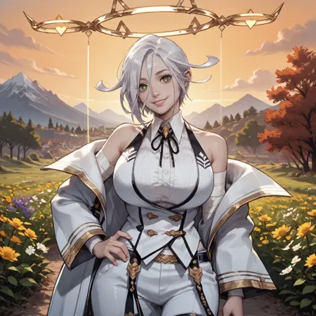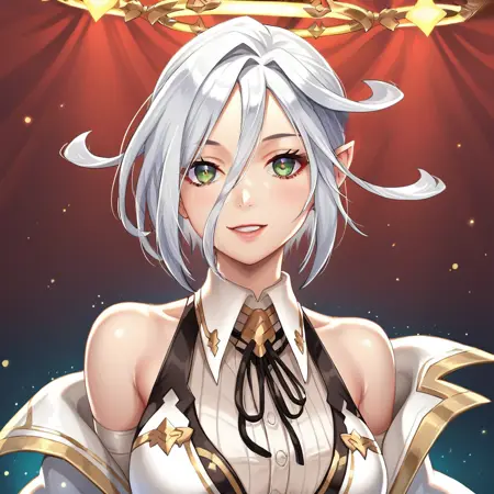 默认外观:Sandalphon_dragalia,眼睛上的符号,绿色眼睛,白发,苍白皮肤,白色夹克,长袖,裸露肩膀,复杂的光轮,颈部领结,肚脐,