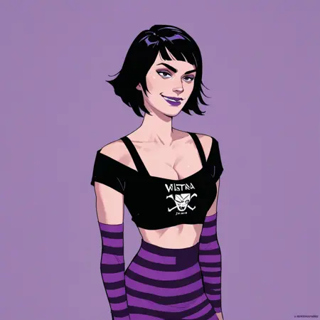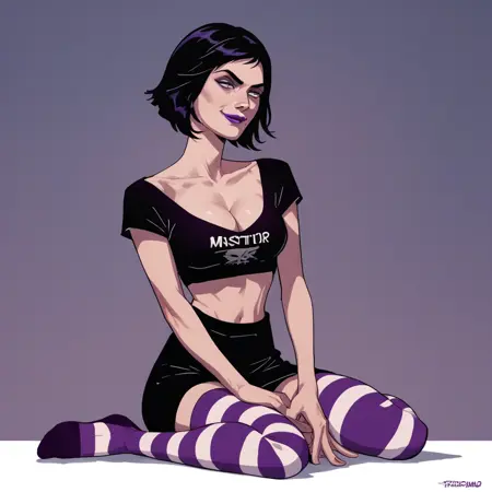 striped thighhighs, skirt, black croptop, makeup, purple lipstick,