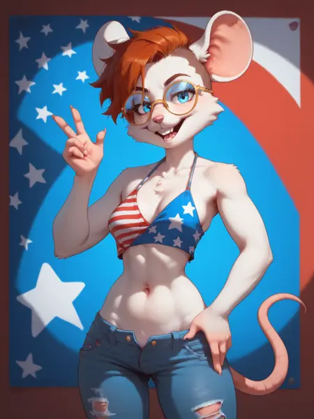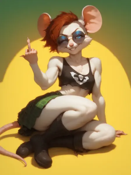 I decided to create a furry character. Maizy is an anthro mouse girl (Trigger: "mouse") with a strong geek streak, sporting an auburn undercut hairstyle. When I trained the LoRA, I picked a signature look for Maizy: round glasses with yellow tinted lenses (trigger: "glasses"), a blue tartan skirt (trigger: skirt), a black tank top, and combat boots.
