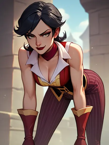 cleavage, red jacket, sleeveless, striped pants, high heel boots,