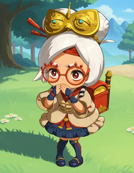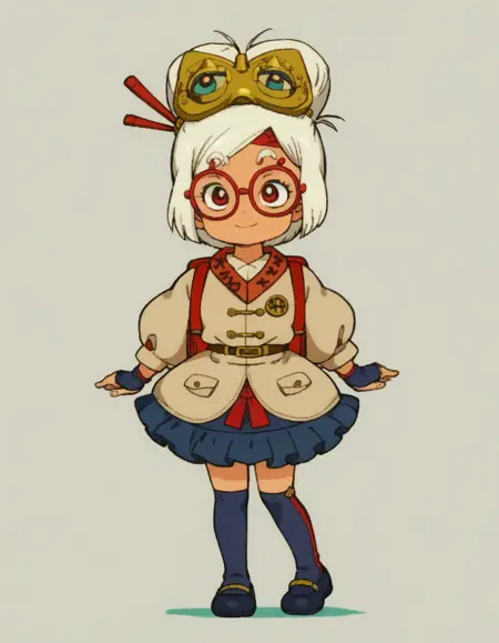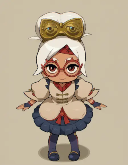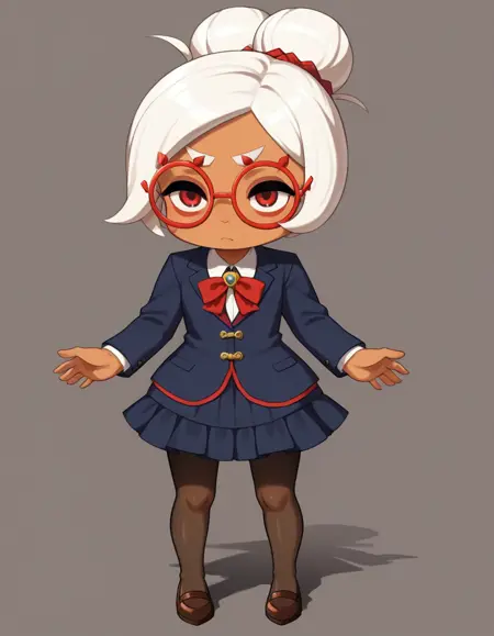 옷: 빨간 프레임 안경, 베이지 잭킷, 파란 치마, 프릴 치마, 파란 양말, 무릎높이 양말, 파란 신발, 메리제인, 빨간 헤드밴드, 머리에 고글, 머리빗, 머리구슬, 손가락 없는 장갑, 파란 장갑, 페티코트