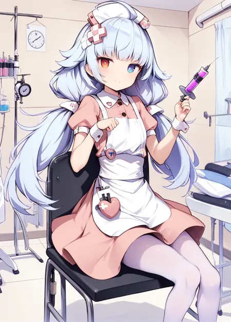 간호사 복장(nurse nicholas): nicholas(azur_lane), 이색 홍채, 낮은 트윈테일, by kedama_milk, 머리 장식, 흰색 에프론, 흰색 팬티스타킹, 손목 커프스, 볼륨 있는 짧은 소매, 칼라 드레스, 간호사 모자,