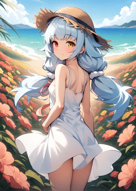 원본(origen): nicholas(azur_lane), 이색 홍채, 낮은 트윈테일, 졸린, by kani_biimu, 흰색 허벅지 양말, 어깨 드레스,