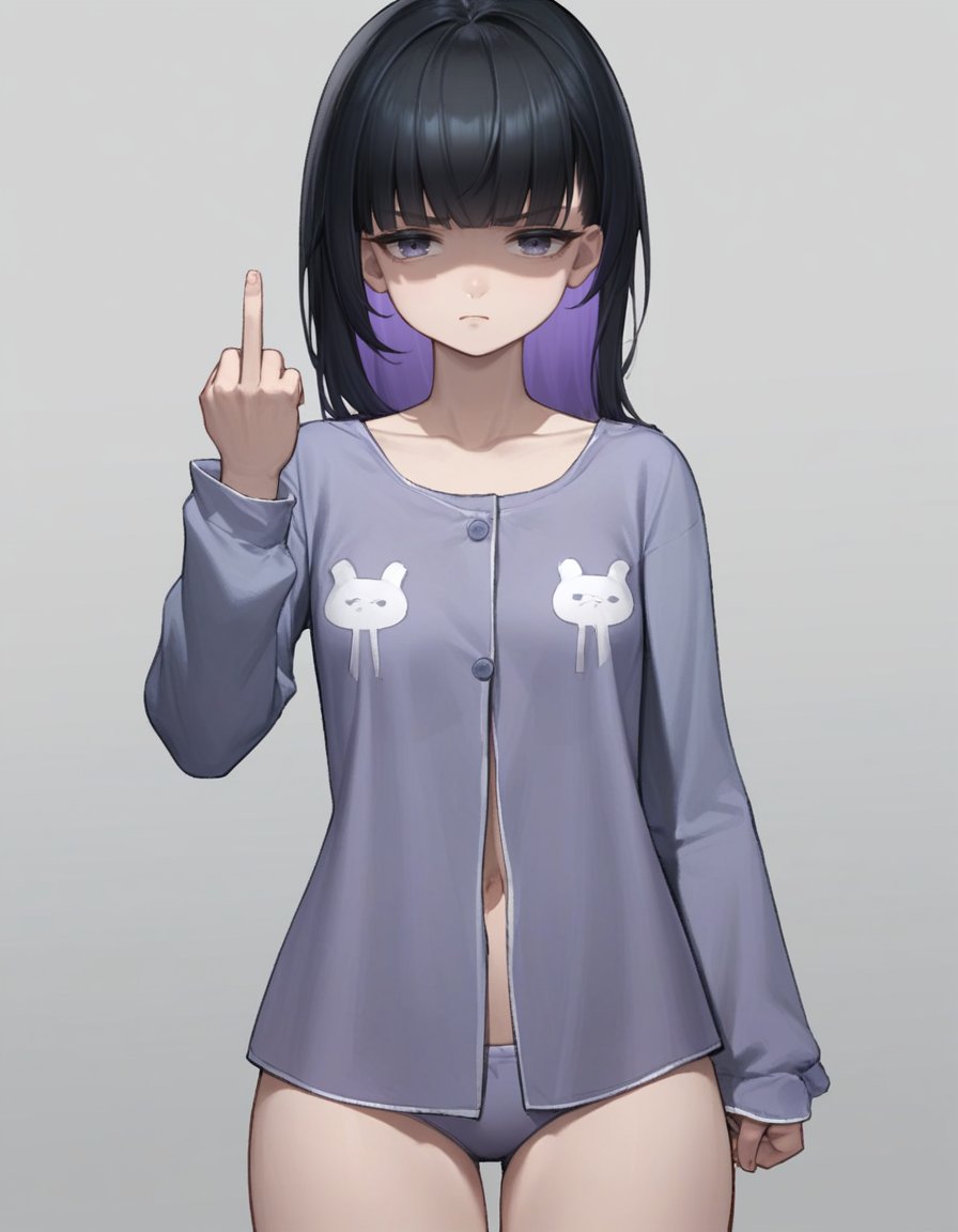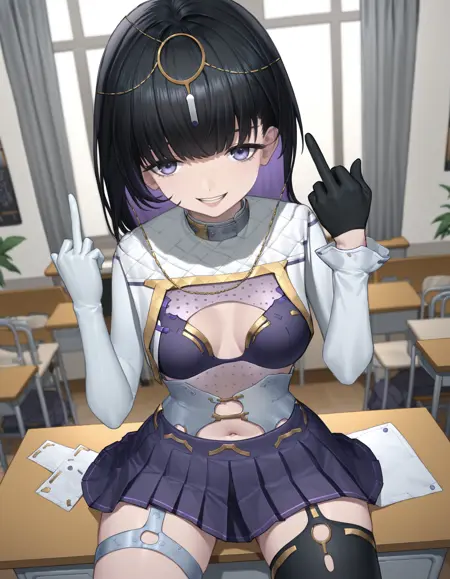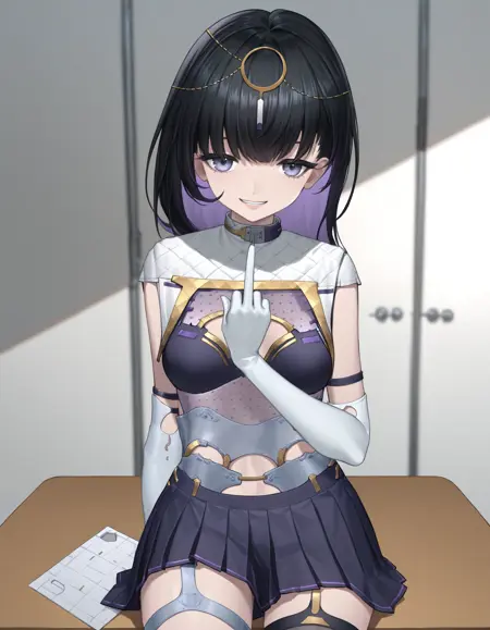 pi snowbreak,1girl,solo,black hair,multicolored hair,colored inner hair,bangs,purple hair,breasts,asymmetrical clothes,pleated skirt,thighhighs,elbow gloves,hair ornament,single thighhigh,skirt,gloves,