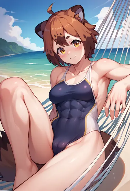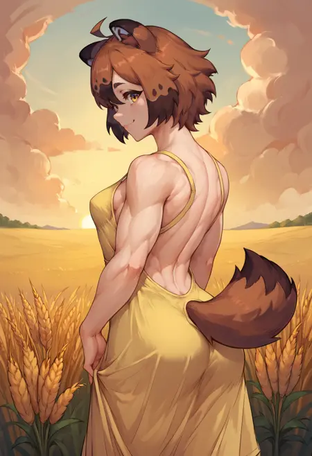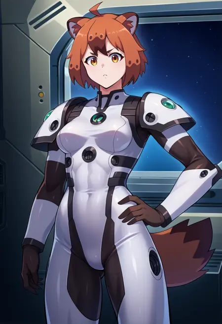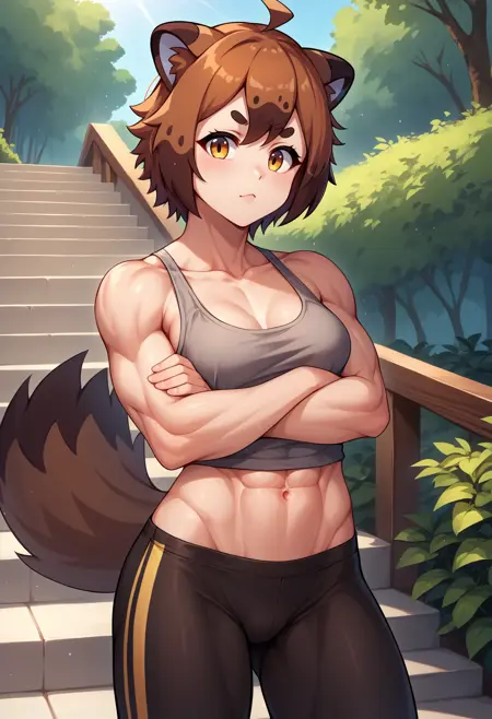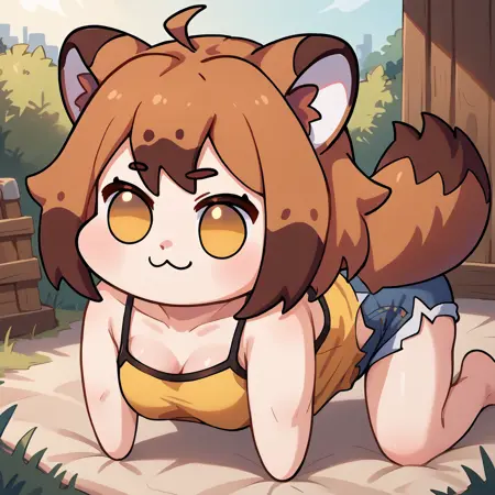触发词:必须始终包含 "tanukiwers, raccoon girl, animal ears, raccoon tail, yellow eyes, short hair, ahoge, multicolored hair, medium breasts, toned" 以确保准确性。
