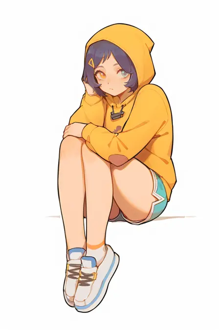 기본 옷차림은 노랑 후디, 반바지, 어깨 가방입니다. 노랑 후디 태그는 후디만 생성하므로 나머지 부분을 위해 반바지 태그도 필요합니다(이 태그는 양말과 신발도 포함합니다). 가방을 생성하려면 어깨 가방 태그를 사용하세요.