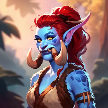 示例提示:食人魔、大尖耳、大鼻子、獠牙、象牙、1girl、蓝色皮肤、绿色眼睛、红色头发