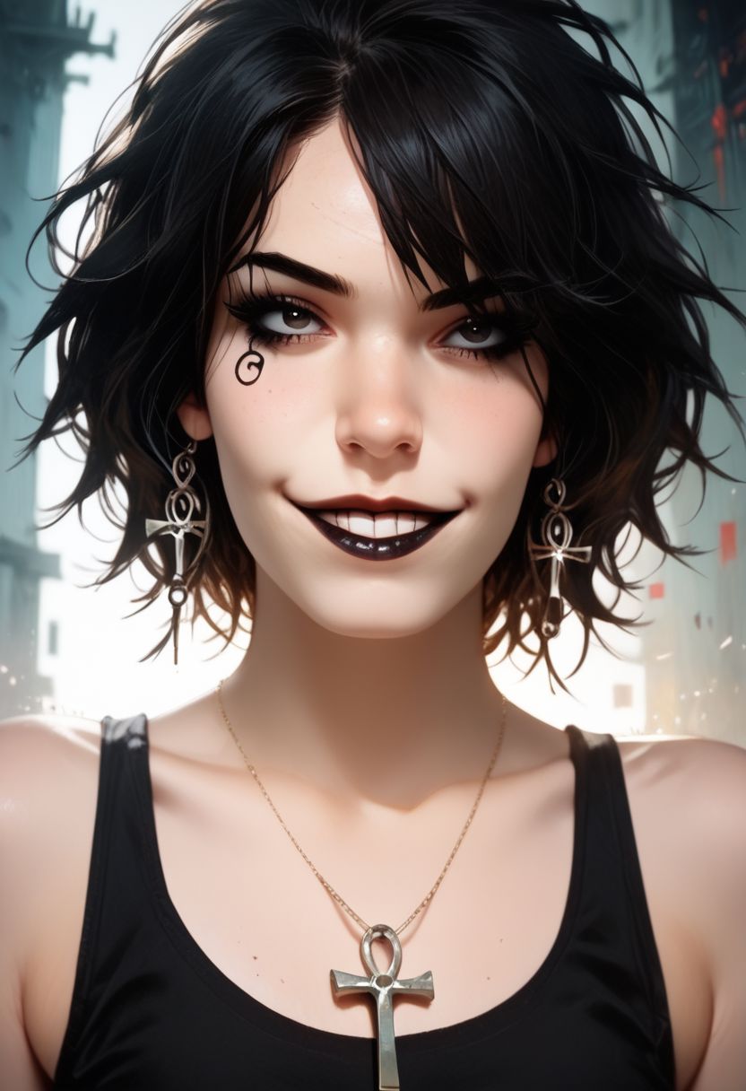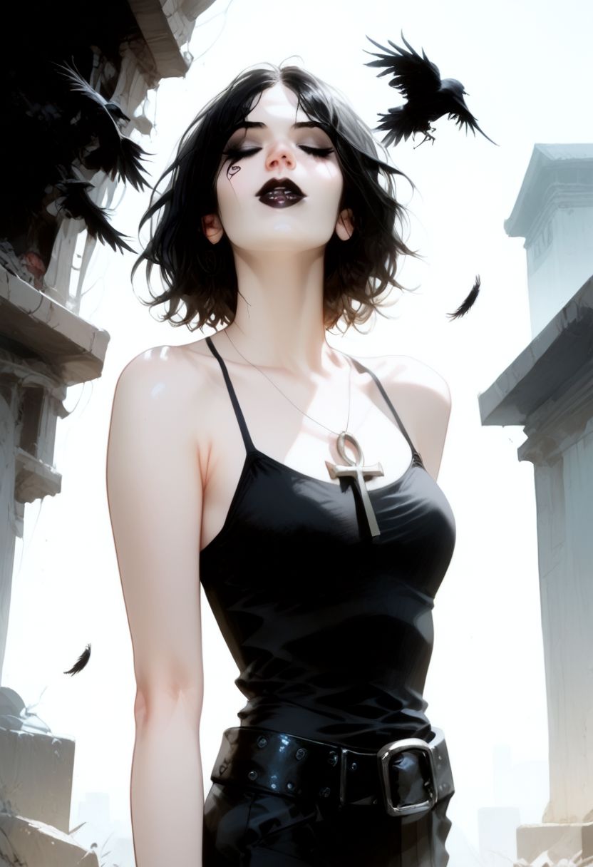 プロンプトアクチベーター:1girl, Death, Death of the Endless, \(DC Comics\)/,(ultra HD quality details), pale skin, black eyes, black hair, goth girl, gothic style, makeup, black lips, tattoo under eye,