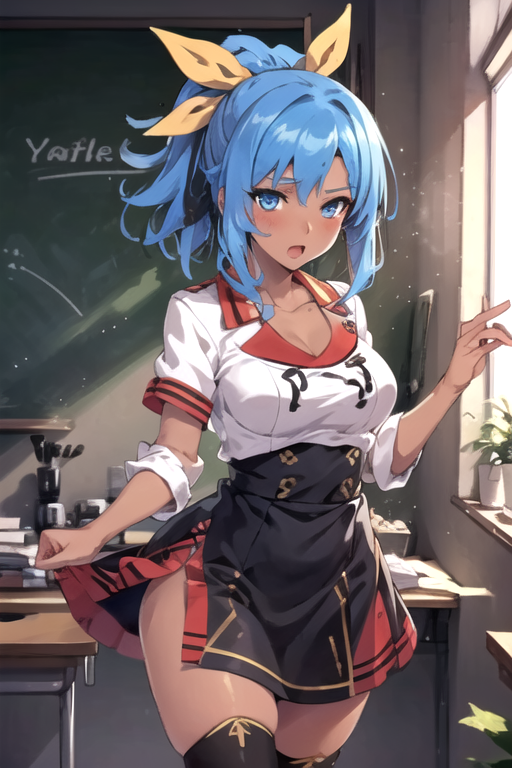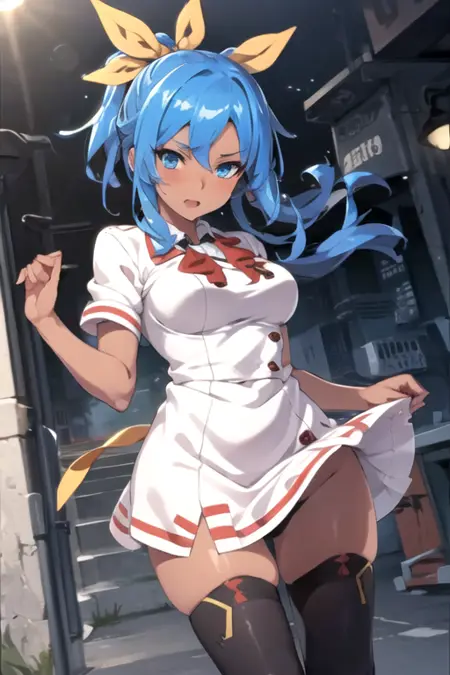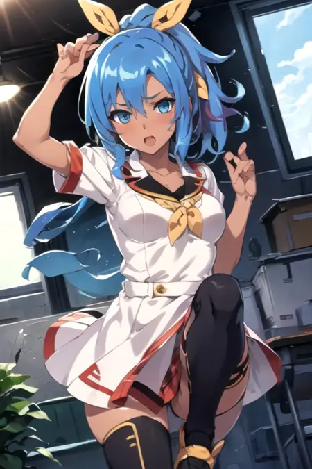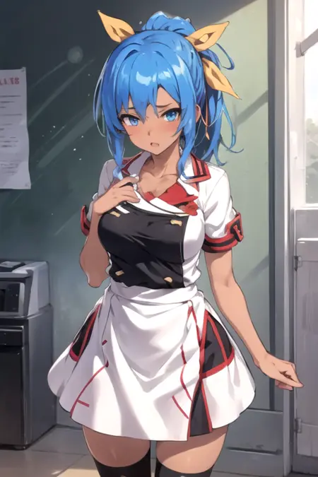 Griff1nRedram, 1girl, solo, blue eyes, black thighhighs, dress, ribbon, school uniform, blue hair, hair ribbon, ponytail, dark skin, dark-skinned female, yellow ribbon