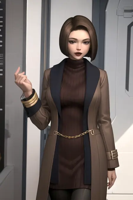 JuliMizrahi, 1girl, solo, short hair, brown hair, dress, brown eyes, jewelry, pantyhose, brown sweater, turtleneck, bob cut, lipstick, wristwatch, brown long coat
