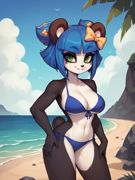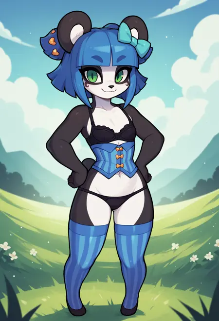 基础提示词:1girl, nuwa,蓝色头发,齐刘海,短发,绿眼睛,发带,毛茸茸,熊猫耳朵,尾巴