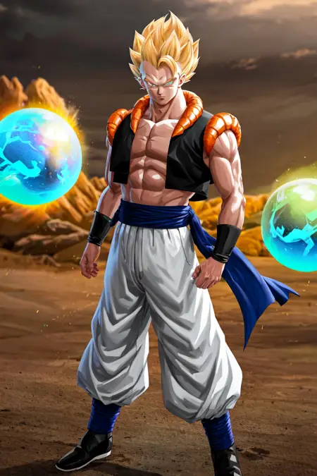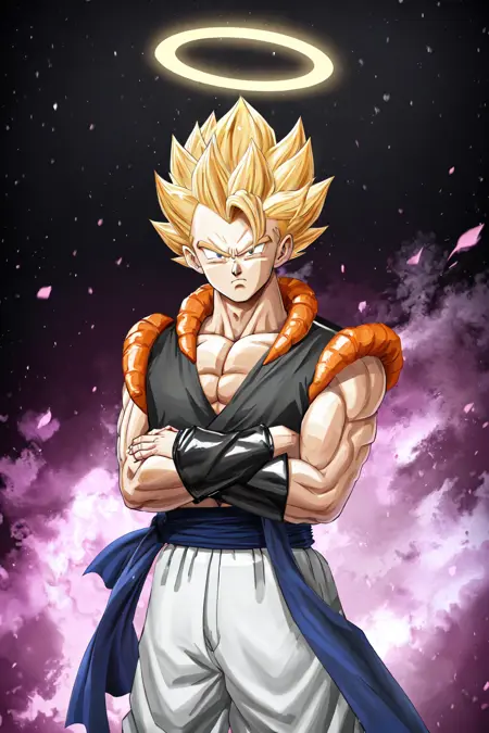 gogeta, 1boy, vest, blue sash, wristband, white pants