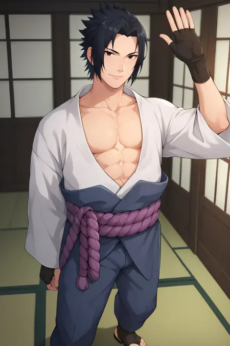 ➜ SasukeSXL, black eyes, black hair, short hair, spiked hair, parted bangs, pectorals, collarbone, open kimono, japanese clothes, white kimono, long sleeves, black gloves, fingerless gloves, (sash), purple rope belt, blue pants, black footwear, toeless footwear
