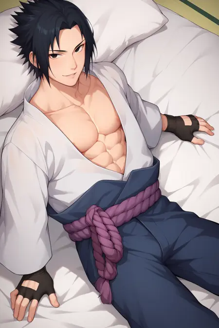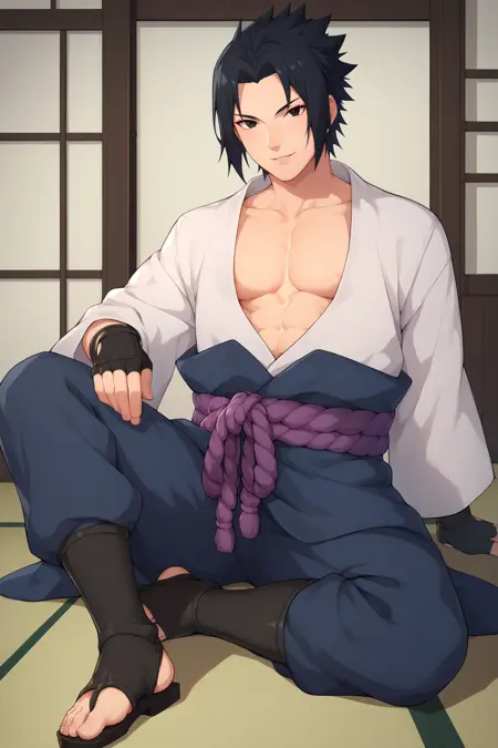 ➜ SasukeSXL,黑眼睛,黑发,短发,尖刺发型,分刘海,胸肌,锁骨,敞开的和服,日本服饰,白色和服,长袖,黑色手套,无指手套,(腰带),紫色绳带,蓝色长裤,黑色鞋履,露趾鞋履