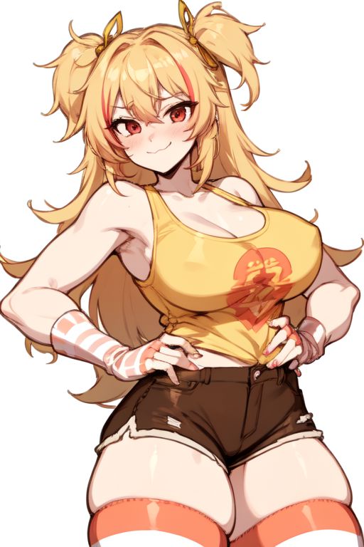 | 训练词汇 | Miocrushcrush, 1girl, little hair ribbons, solo, blonde hair, long hair, yellow tanktop, symbol on tanktop, multicolored hair, short shorts, striped thighhighs, large breasts, red eyes, striped fingerless gloves, striped sleeves, streaked hair,已复制! |
