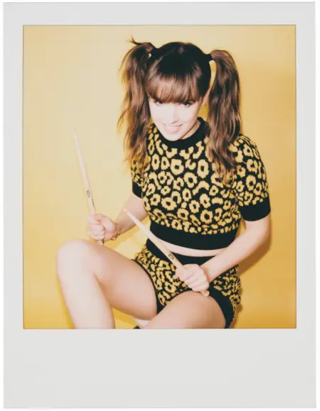 一张以Maripol风格拍摄的长发女子身穿黑色夹克的宝丽来照片
