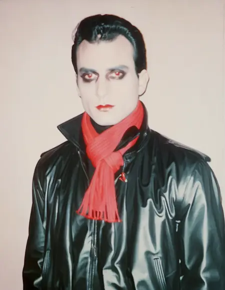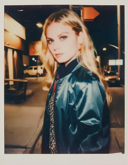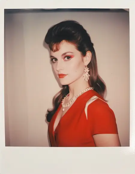 a polaroid photo of a woman with long hair and a black jacket in the style of maripol