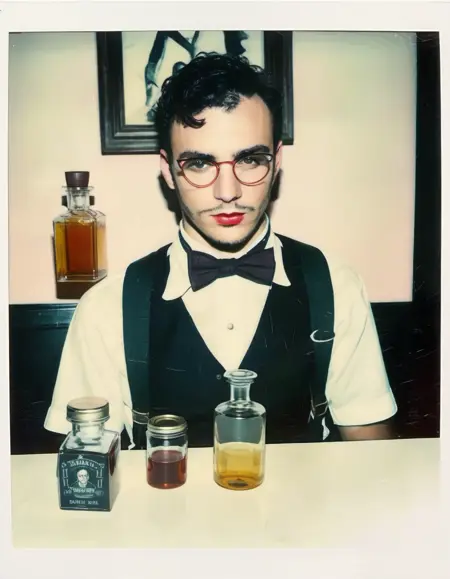 a polaroid photo of a group of people standing around a man in a hat in the style of maripol