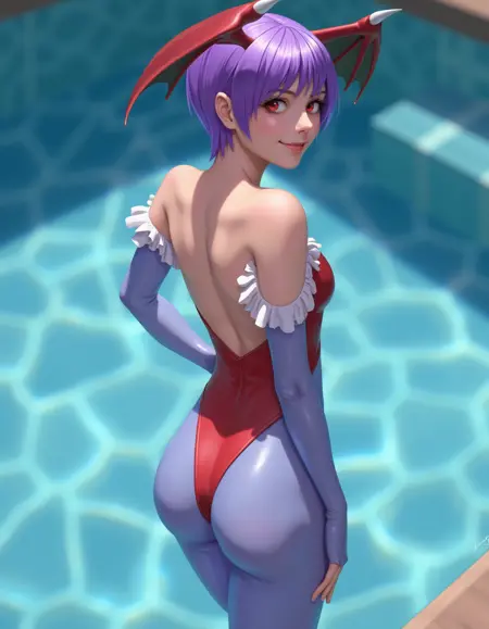 기본 외모: 박쥐 무늬, 박쥐 날개, 신부용 장갑, 가슴 노출, 의상 노출, 데몬 소녀, 다이아몬드 노출, 머리 날개, 레오타드, 팬티스타킹, 프린트 팬티스타킹, 보라색 머리, 붉은 눈, 빨간 레오타드, 단발, 스트랩 없음, 스트랩 없는 레오타드, 날개, 하이힐,