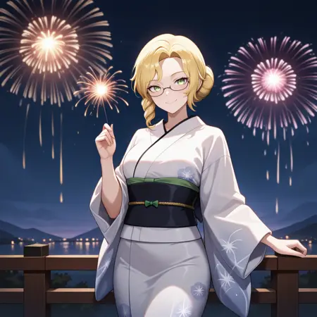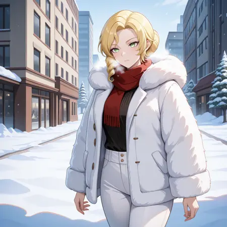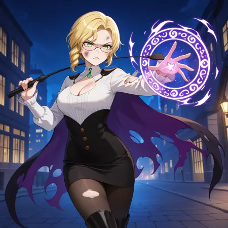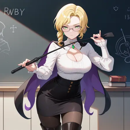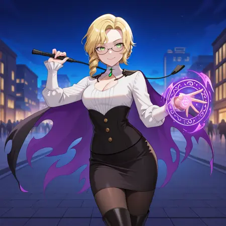 Optional: Blonde hair, green eyes, white shirt, pencil skirt, glasses, knee high boots, pantyhose, cape