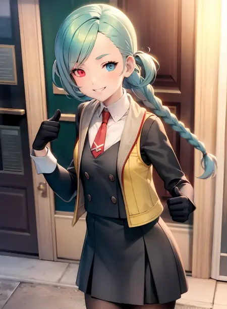 大人びた美月の場合は、プロンプトに ainimizuki, vest, red necktie, heterochromia, twin braids, dress skirt, black gloves, collar, sleeves_rolled_up を使用してください。