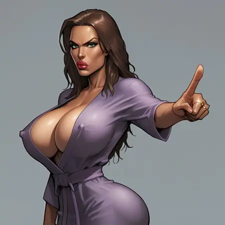 1girl,长发,乳房,棕发,妆容,口红,勃起乳头,乳头被遮盖的乳房,大乳房,水蓝色眼睛,细腰,翘臀,嘴唇,戒指,成熟女性,乳头,嘴唇,古铜色皮肤,敞开的紫色浴袍,