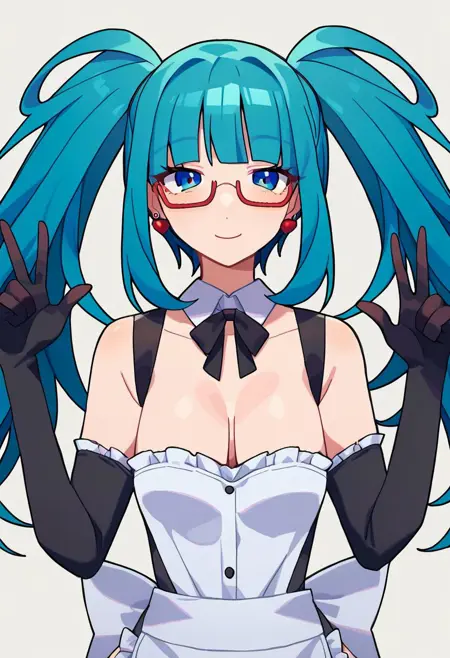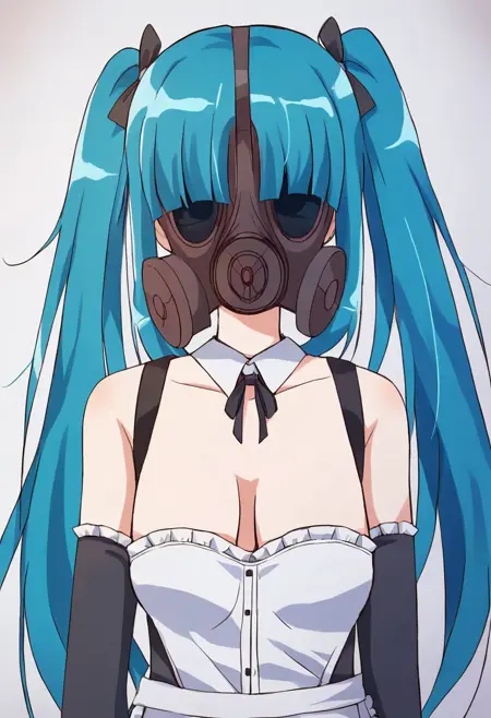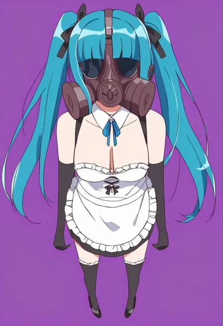 전신 이미지에는 "허벅지 긴 양말, 검은 신발, 하이힐"을, 마스크 버전에는 "가스 마스크"를 추가할 수 있습니다.