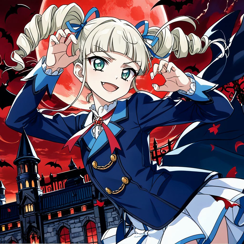 trigger: todo yurika, green eyes, platinum blonde hair, blunt bangs, drill hair, twin drills, hair bow, bow,ribbon,fang,fang out, starlight academy school uniform,blue jacket,white skirt white footwear, knee boots