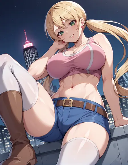 heart earrings, open jacket, white jacket, cropped jacket, pink crop top, sports bra, midriff, navel, belt, short shorts, blue shorts, white thighhighs, brown footwear, boots