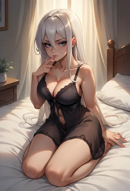 AngeliseReiter, white hair, long hair, hair between eyes, makeup