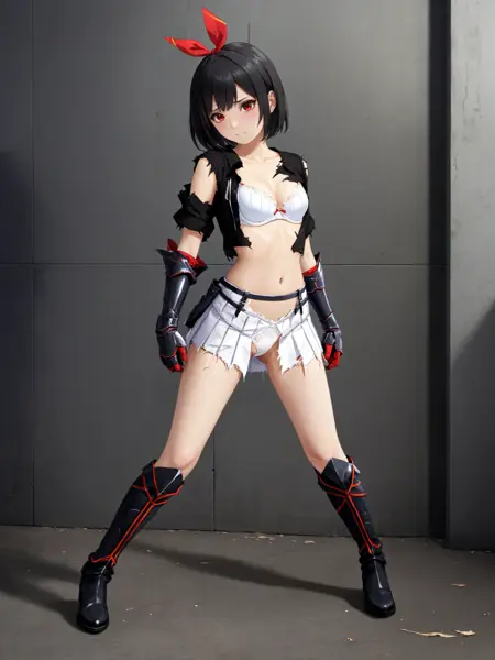 - serafuku, yellow bowtie, fingerless gloves, black footwear, armored boots