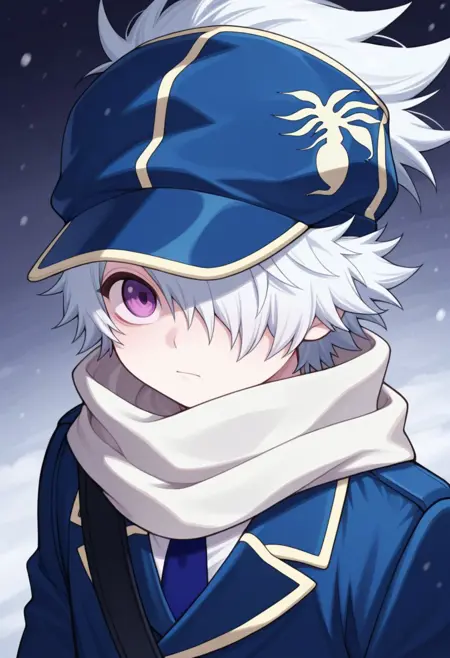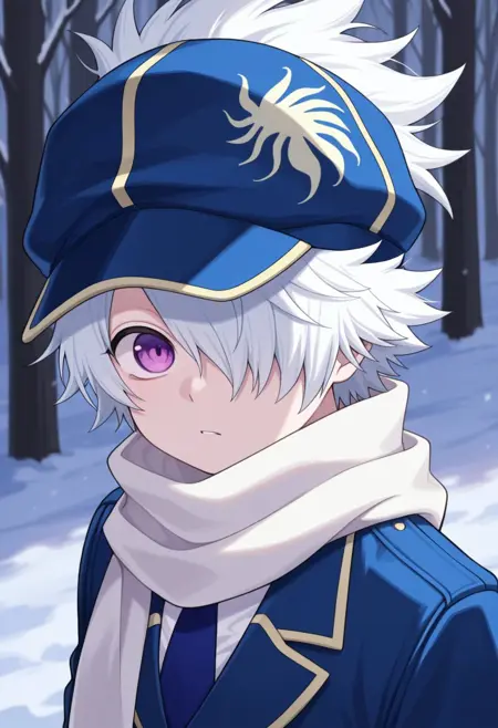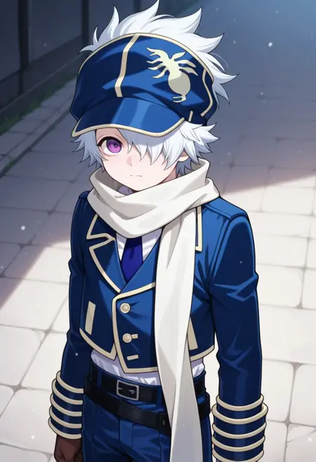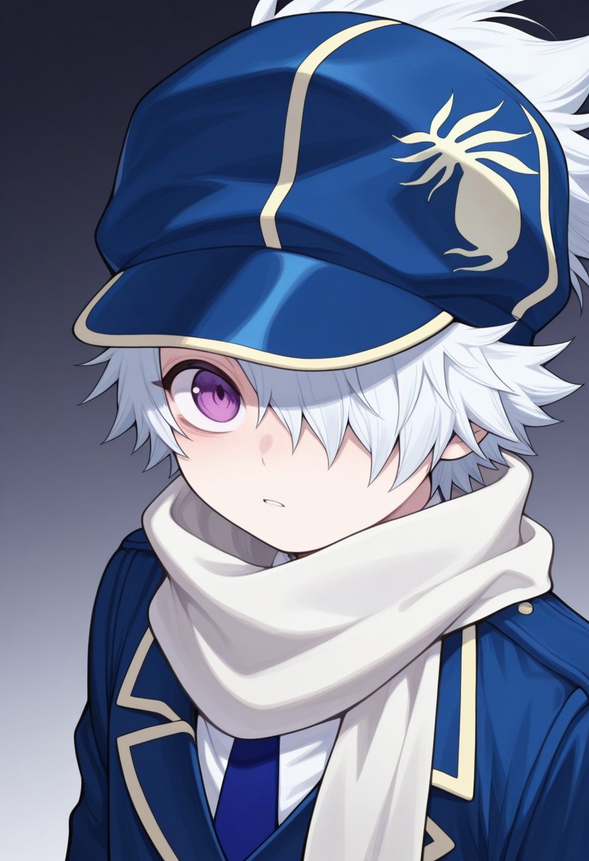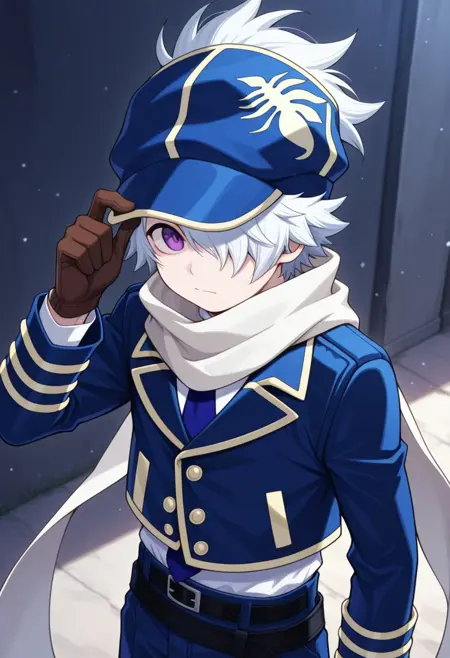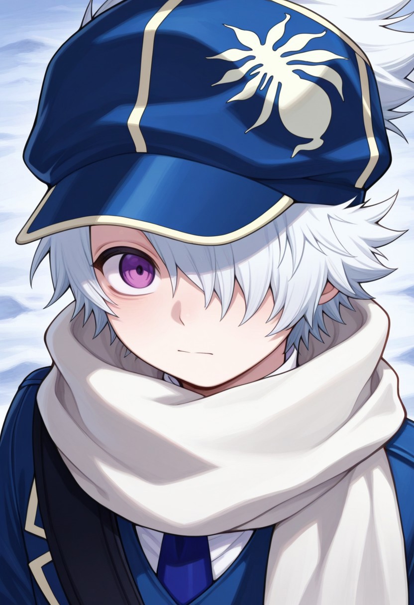 信蜂制服: lag, 1boy, 男性焦点, 围巾, 手套, 帽子, 制服, 发丝遮住一只眼睛, 紫色眼睛, 白发, 蓝色制服, 夹克, 裤子, 袜子, 靴子