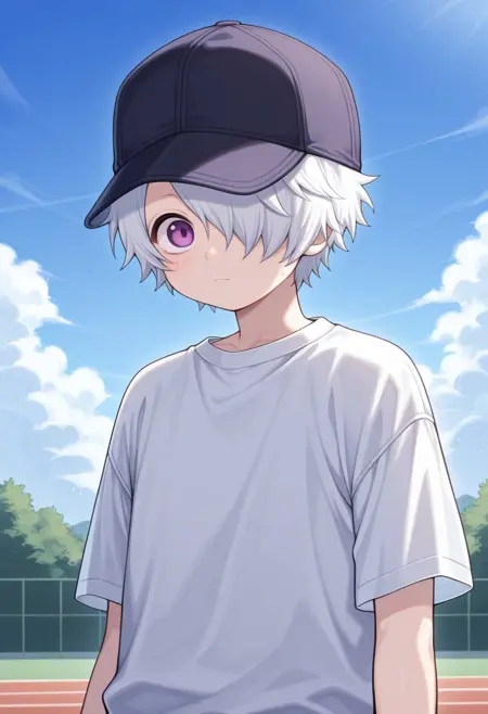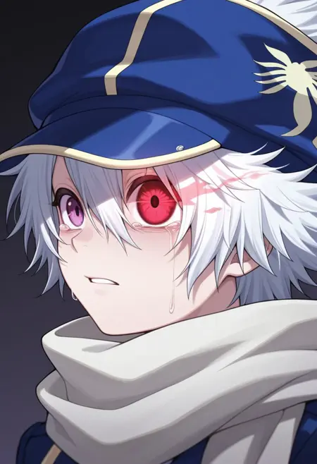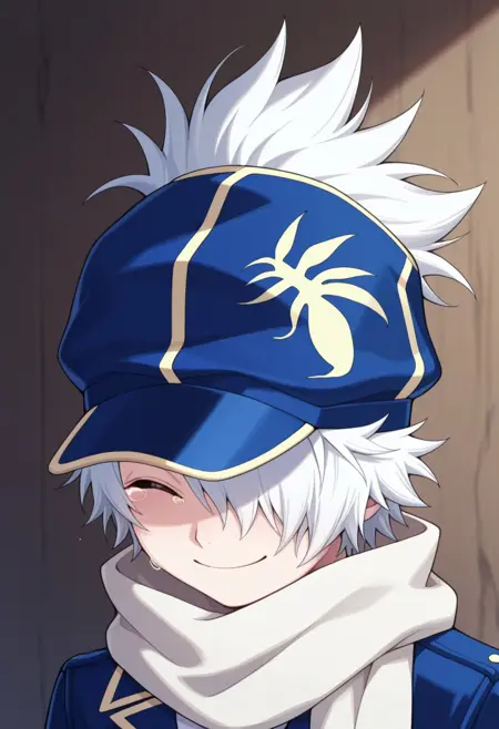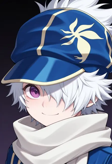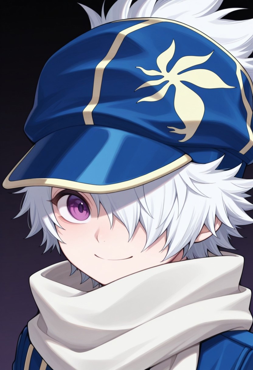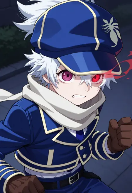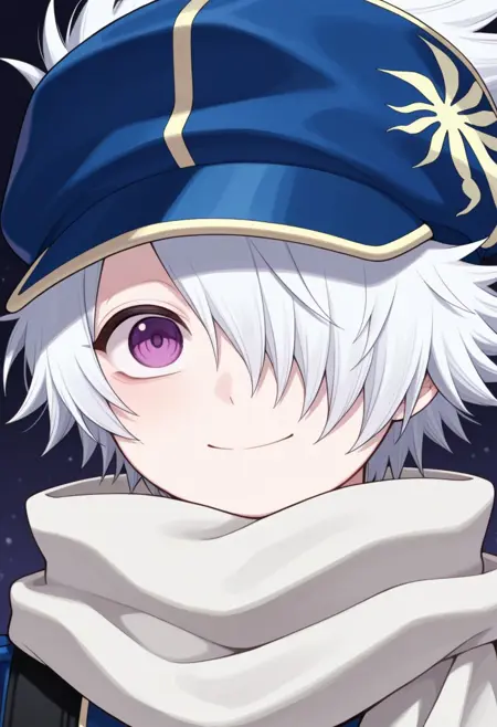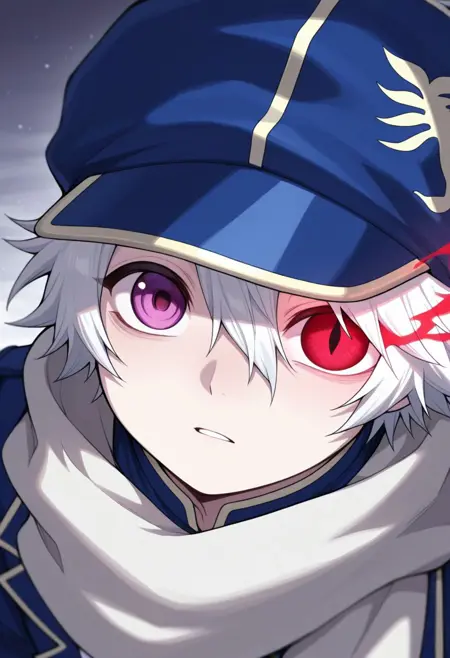 信蜂制服: lag, 1boy, 男性焦点, 围巾, 手套, 帽子, 制服, 发丝遮住一只眼睛, 紫色眼睛, 白发, 蓝色制服, 夹克, 裤子, 袜子, 靴子