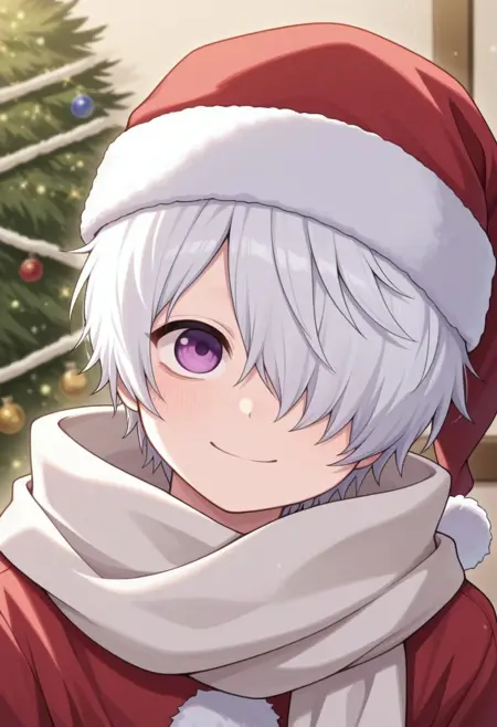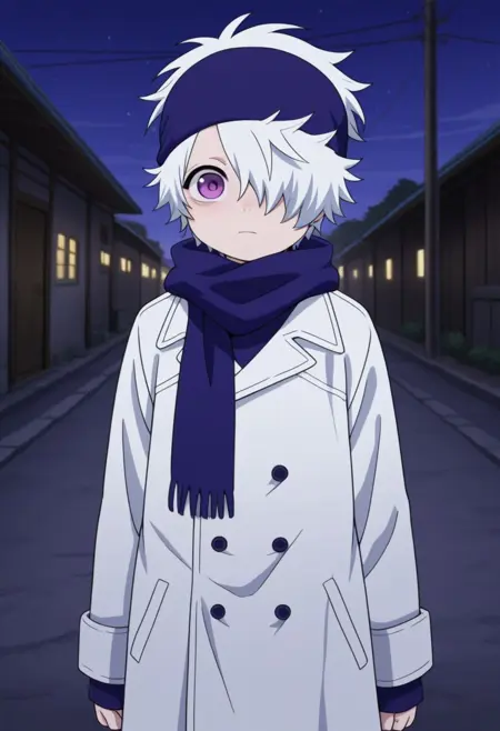 休闲装: lag, 1boy, 男性焦点, 围巾, 手套, 帽子, 发丝遮住一只眼睛, 紫色眼睛, 白发, 大衣, 裤子, 袜子, 靴子