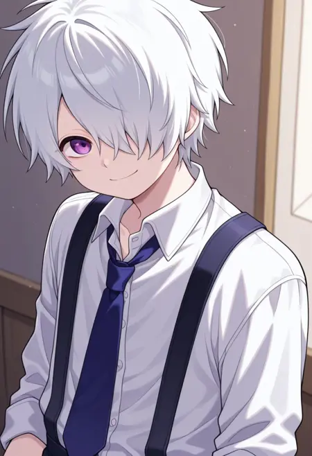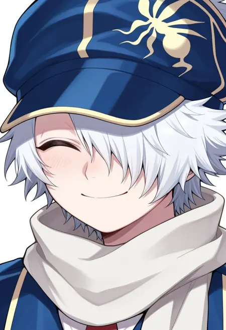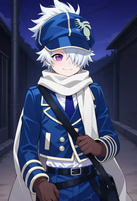 RaguShiingu, 1boy, 男性焦点, 单人, 紫色眼睛, 白发, 发丝遮住一只眼睛, 信蜂制服, 帽子, 蓝色头饰, 围巾, 白色围巾, 衬衫, 白色衬衫, 领带, 蓝色领带, 夹克, 蓝色夹克, 短款夹克, 手套, 棕色手套, 腰带, 裤子, 蓝色裤子, 袜子, 鞋子, 蓝色鞋履