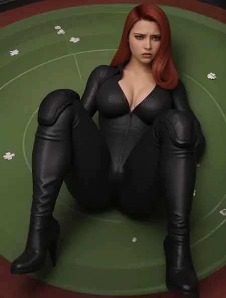 黒いキャットスーツ、レザーボディスーツ、胸元の開き、黒いブーツ、ハイレグブーツ、膝パッド