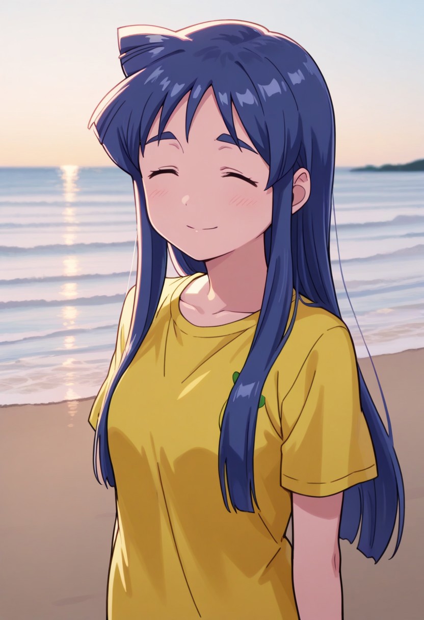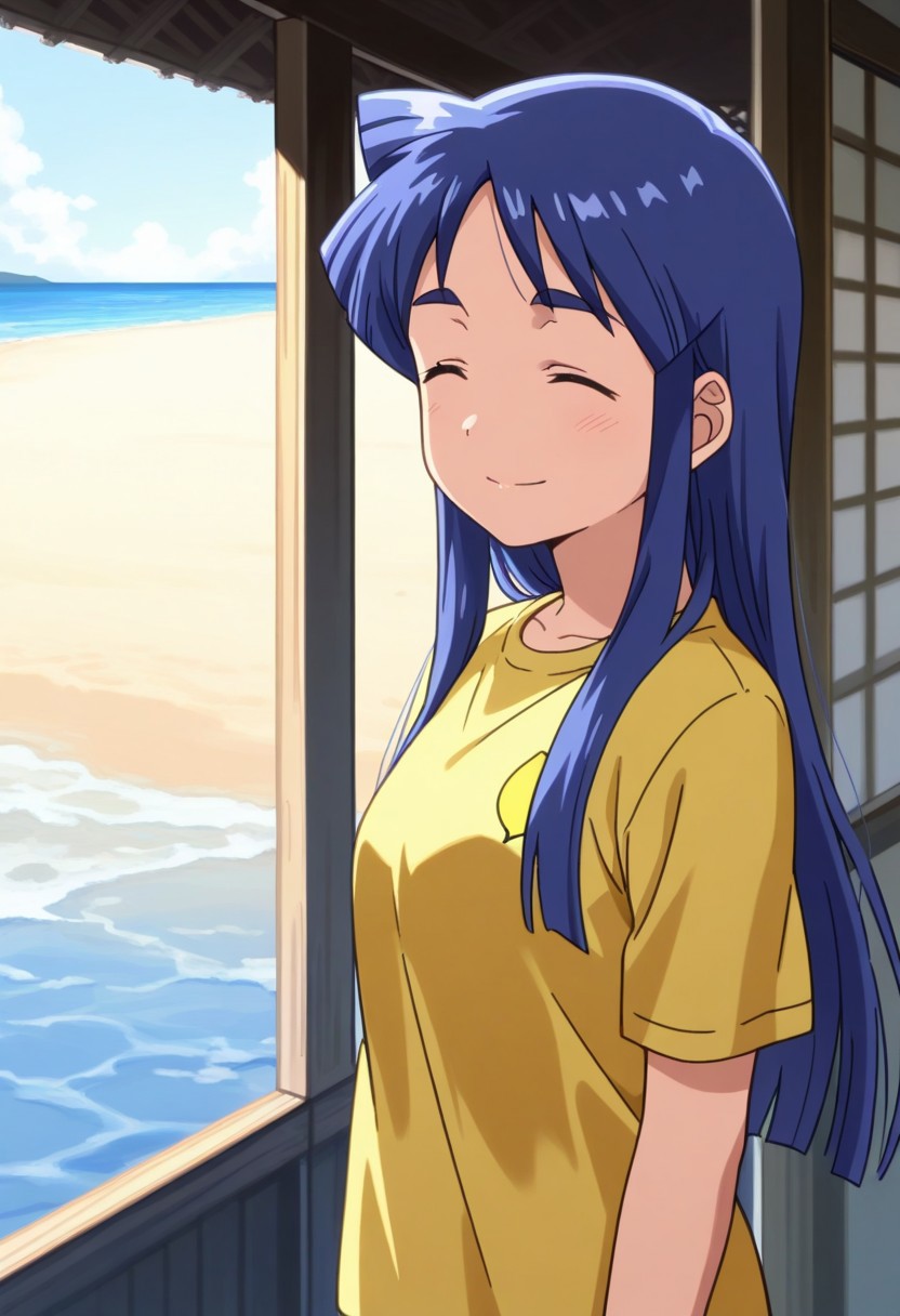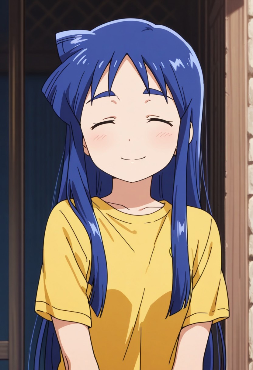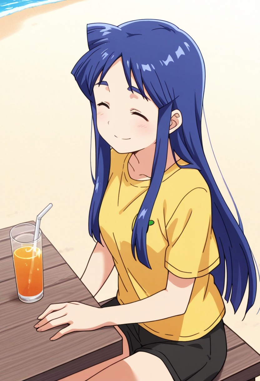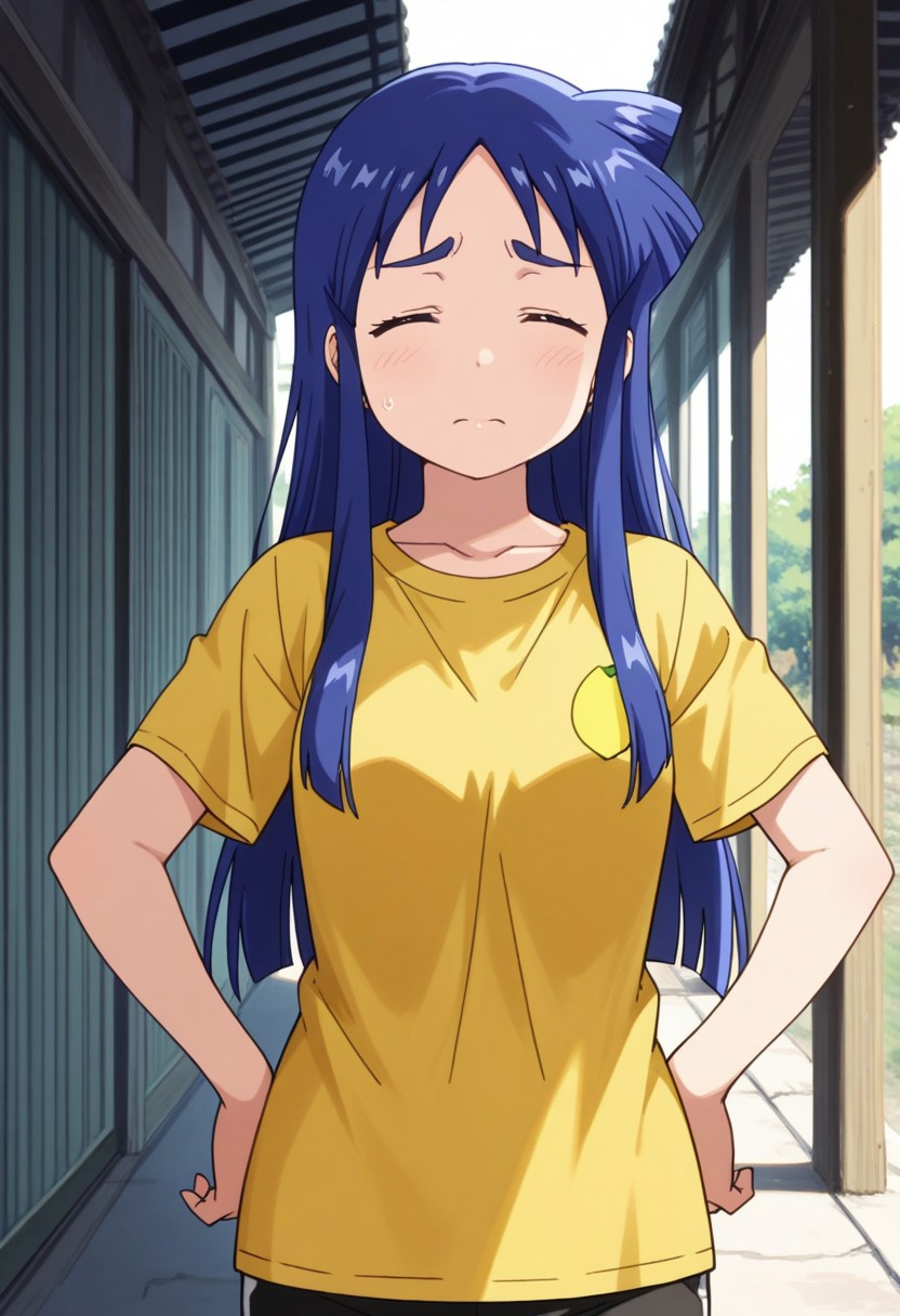 chizuru, 1girl, solo, closed eyes, blue hair, long hair, shirt, t-shirt, short sleeves, yellow shirt, shorts, socks, shoes, sneakers