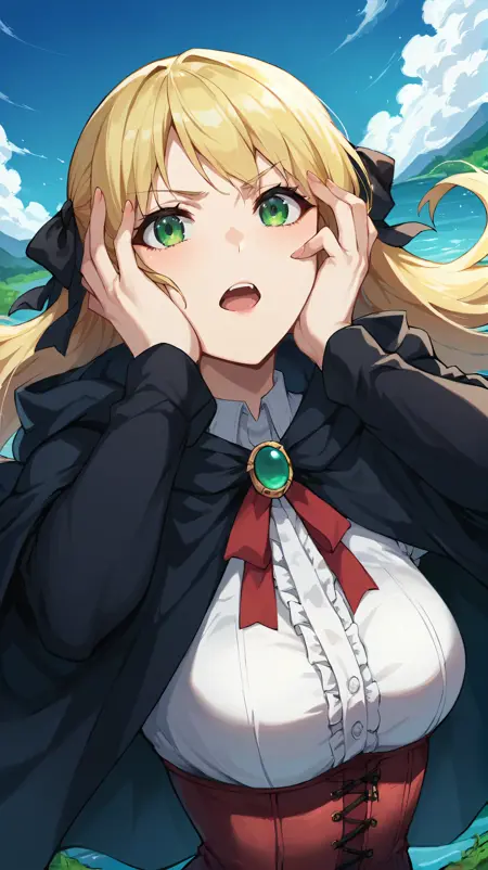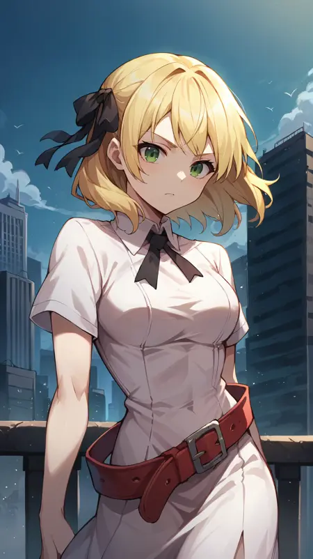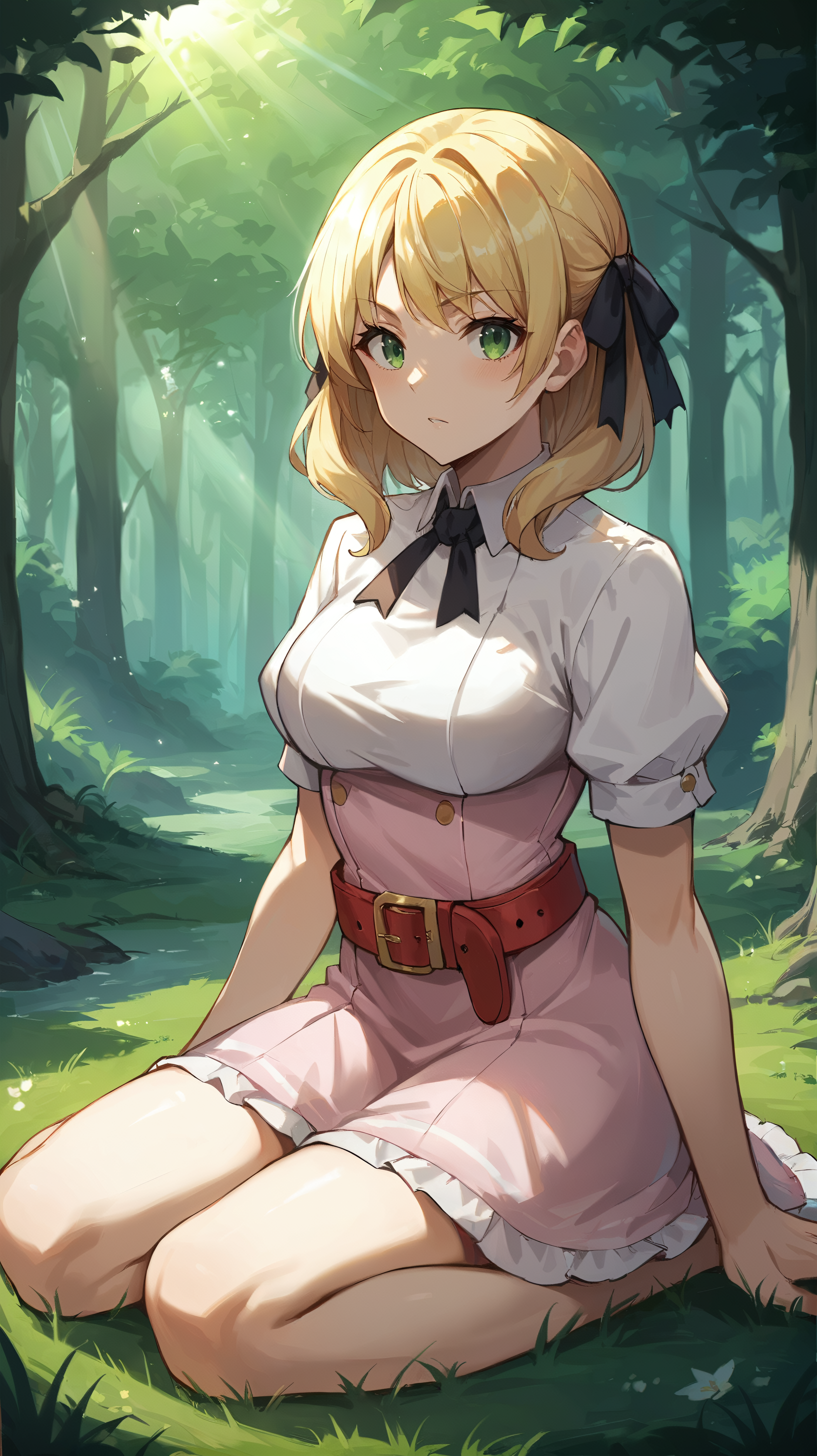 blonde hair, medium hair, green eyes, hair ribbon, pink dress, red belt