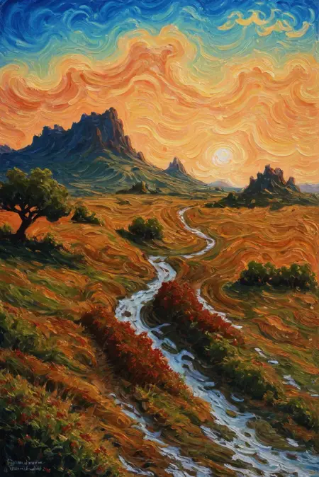 此设置会在生成过程的中段以更高强度激活 LoRA,从而保留笔触纹理和较小的旋涡效果,同时更尊重主模型的构图。下方为该方式的示例。