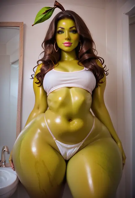 p34r, pear girl, green skin, pear skin, pear shaped, stem on head
