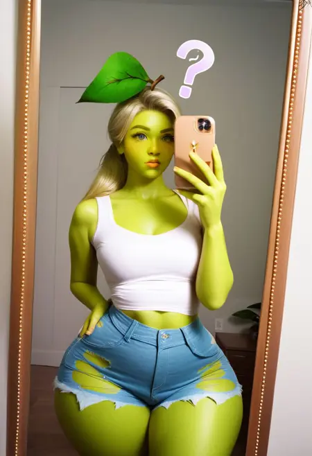 p34r, pear girl, green skin, pear skin, pear shaped, stem on head