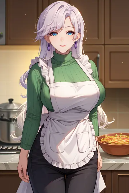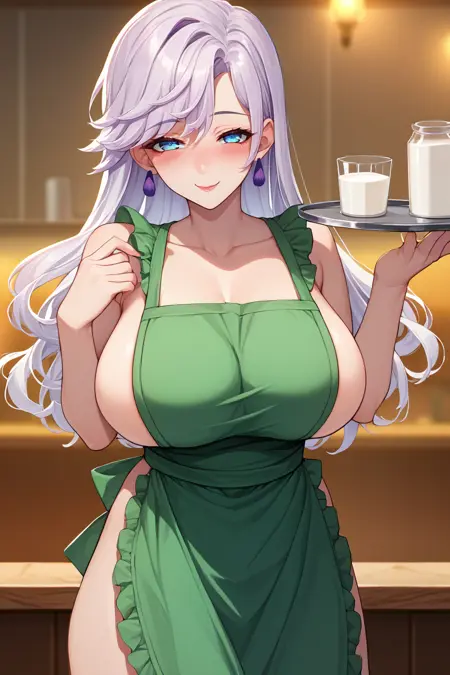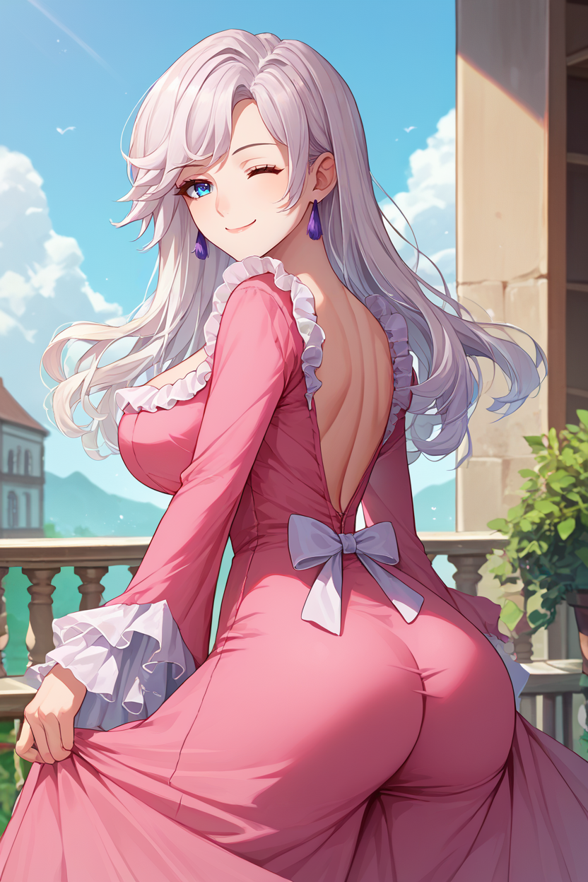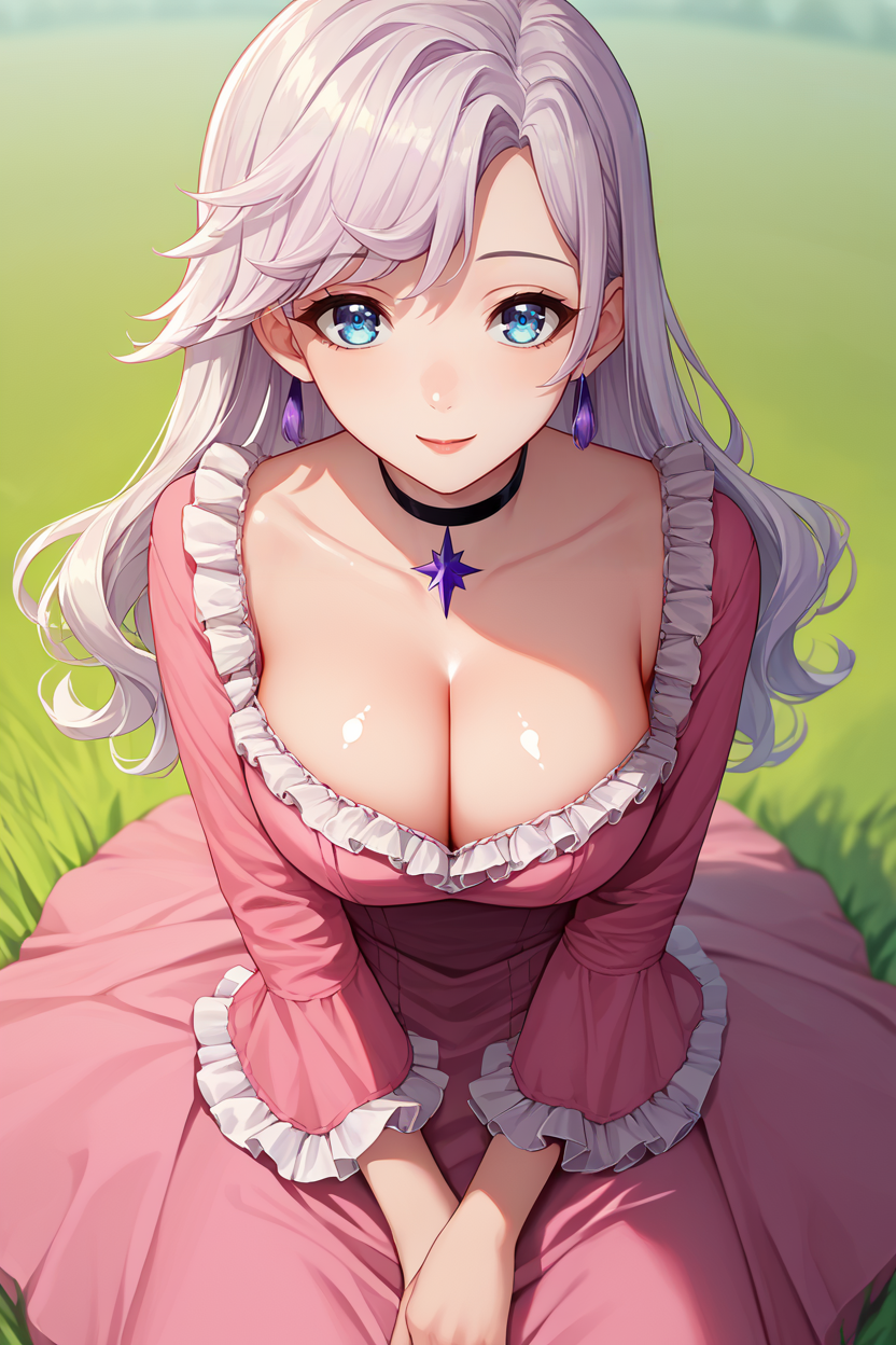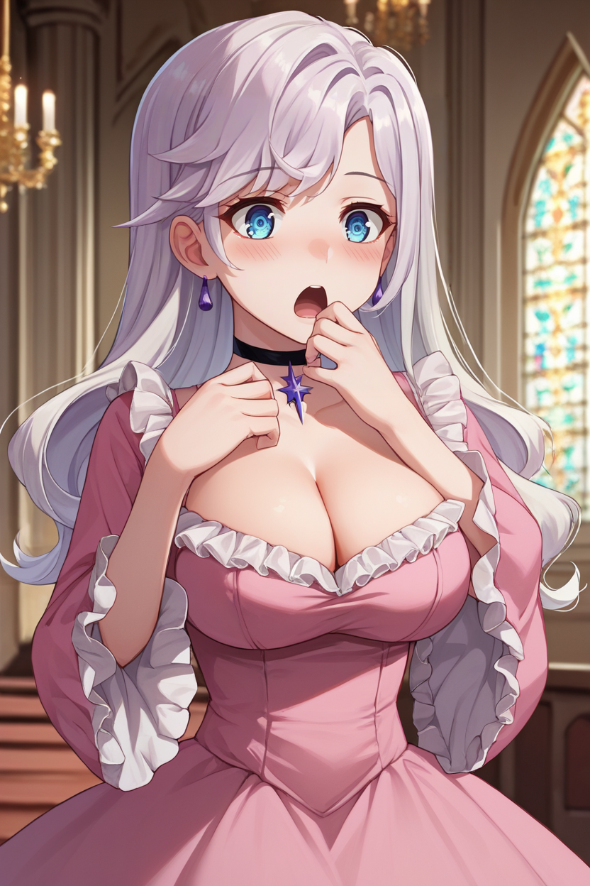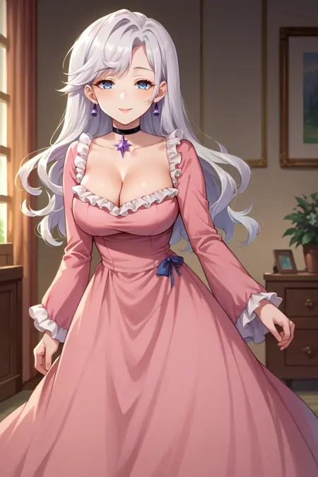 如需呈现她的典型形象,请添加 "耳环,项圈,粉红色连衣裙,长裙,胸脯显露,荷叶边,荷叶边袖子"。