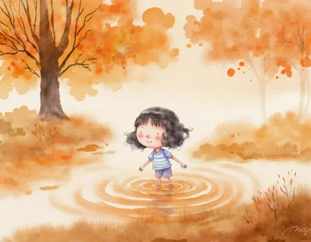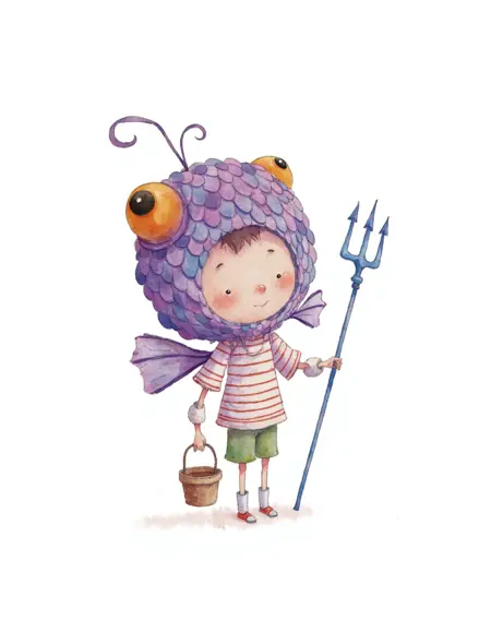大きなオレンジ色の目を持ち、ソフトな紫と青の色調で重なり合ったうろこが並ぶ鮮やかな魚の衣装を着た不思議な子供が、ストライプのシャツと緑色のショートパンツを身に着け、小さな茶色のバケツとシンプルな青い三叉の槍を持ち、ミニマリストな白い背景に描かれたデジタルイラストをadilson-fariasのスタイルで