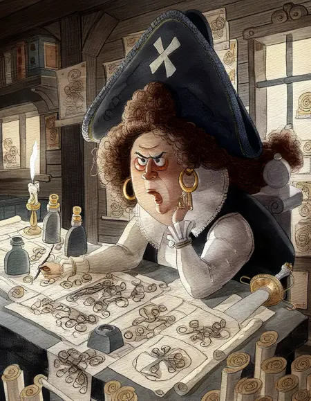 • a digital illustration of a frustrated man with bushy brown hair and a large blue pirate hat adorned with a white cross, sitting in a dimly lit wooden cabin cluttered with scrolls and sketches while intently writing with a quill surrounded by an ink bottle and a candle, enhanced by the warm glow illuminating the rugged wooden surfaces, clothing in muted whites and blacks, with golden hoop earrings and a silver sword at rest on the table, in the style of adilson-farias