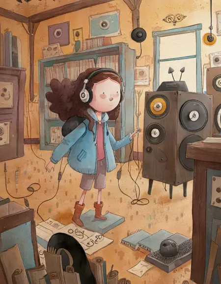 • a digital illustration of a woman wearing a tall, conical hat adorned with small tower designs, her long brown hair flowing past a green dress with a buttoned front, standing in a yellow field with scattered red and orange seed pods, while a flock of black birds flies against a light blue sky in the style of adilson-farias